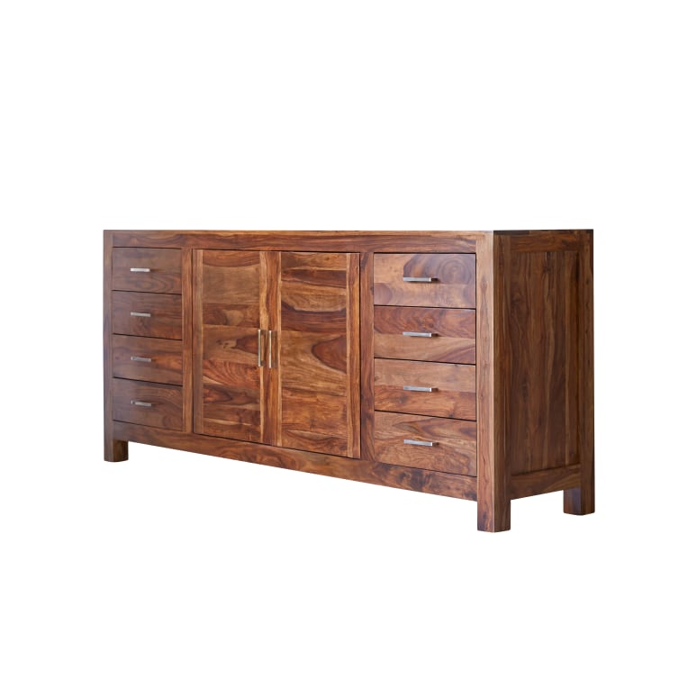 Le sheesham est un bois massif au dessin chamarré, appelé également palissandre des Indes ; ces éventuelles irrégularités sont gage de son authenticité.
